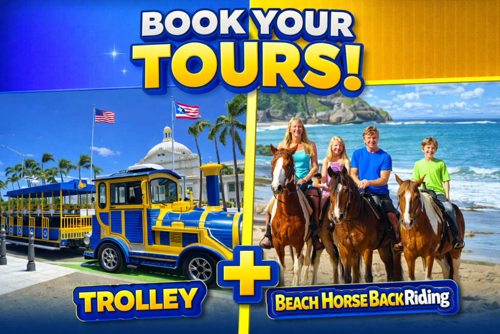 A Simple Combo for an Unforgettable Day in Puerto Rico. Experience one of the most popular combo tours in Puerto Rico with the Trolley Sightseeing Tour + Beach Horseback Riding. This experience takes place approximately 40 minutes from San Juan, making it a perfect option for visitors who want to explore beyond the city.