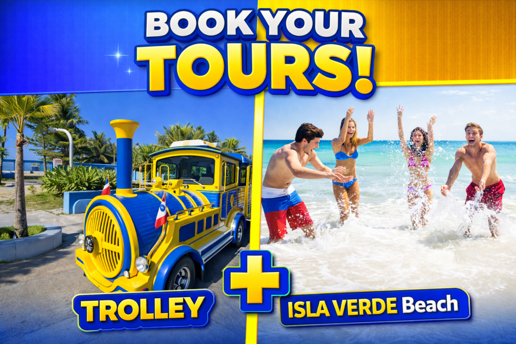 Experience the perfect combination of culture, history, and relaxation with our Trolley Tour + Isla Verde Beach experience. This tour allows you to explore San Juan’s most iconic landmarks and then unwind at one of Puerto Rico’s most beautiful beaches — all in one seamless adventure.